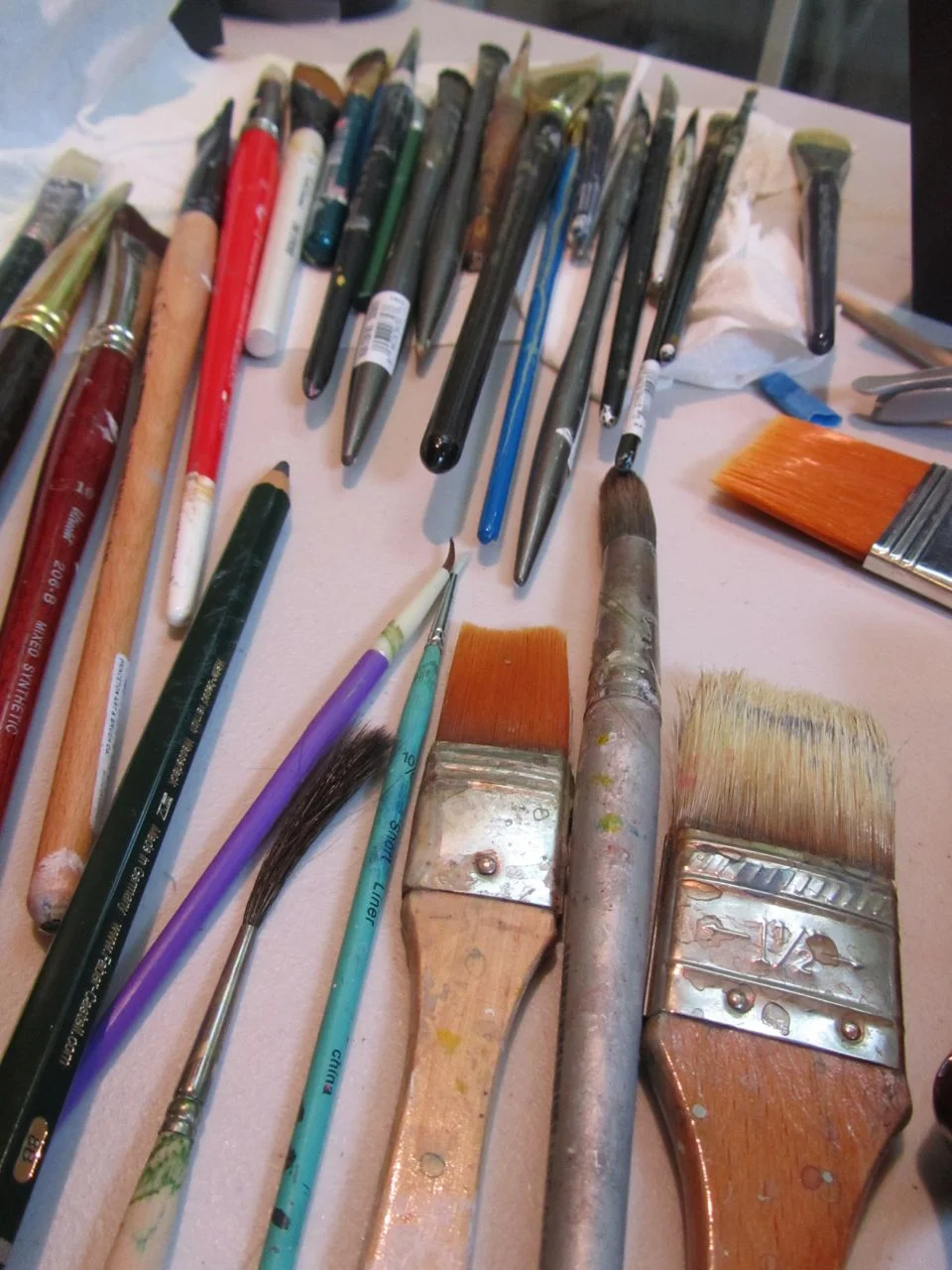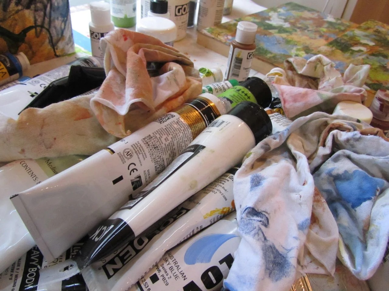 As hard as I try, I can't keep my worktable nice and organized. When I'm the midst of painting, I'm throwing down paint tubes and rags left and right....even when I start off my day by getting everything organized, it ends up looking like this again in a matter of minutes.