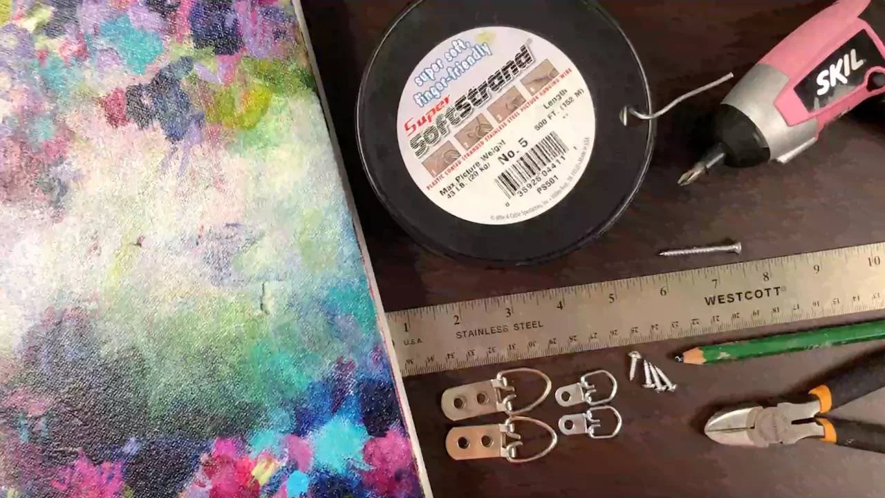 Demonstration showing the supplies and tools I use to attach a hanging wire to the back of a stretched canvas